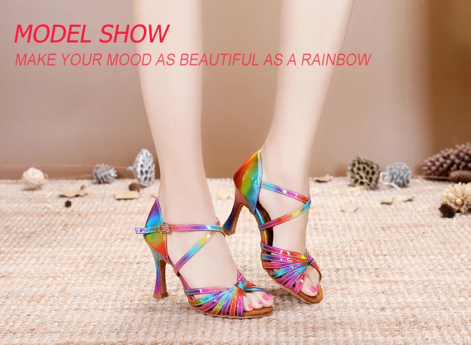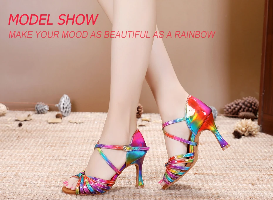 1 review for DILEECHI Latin Dance Shoes Rainbow Colors bright PU Women’s Salsa elegant Cuba high Heel 9cm Ballroom dancing shoes soft outsole
